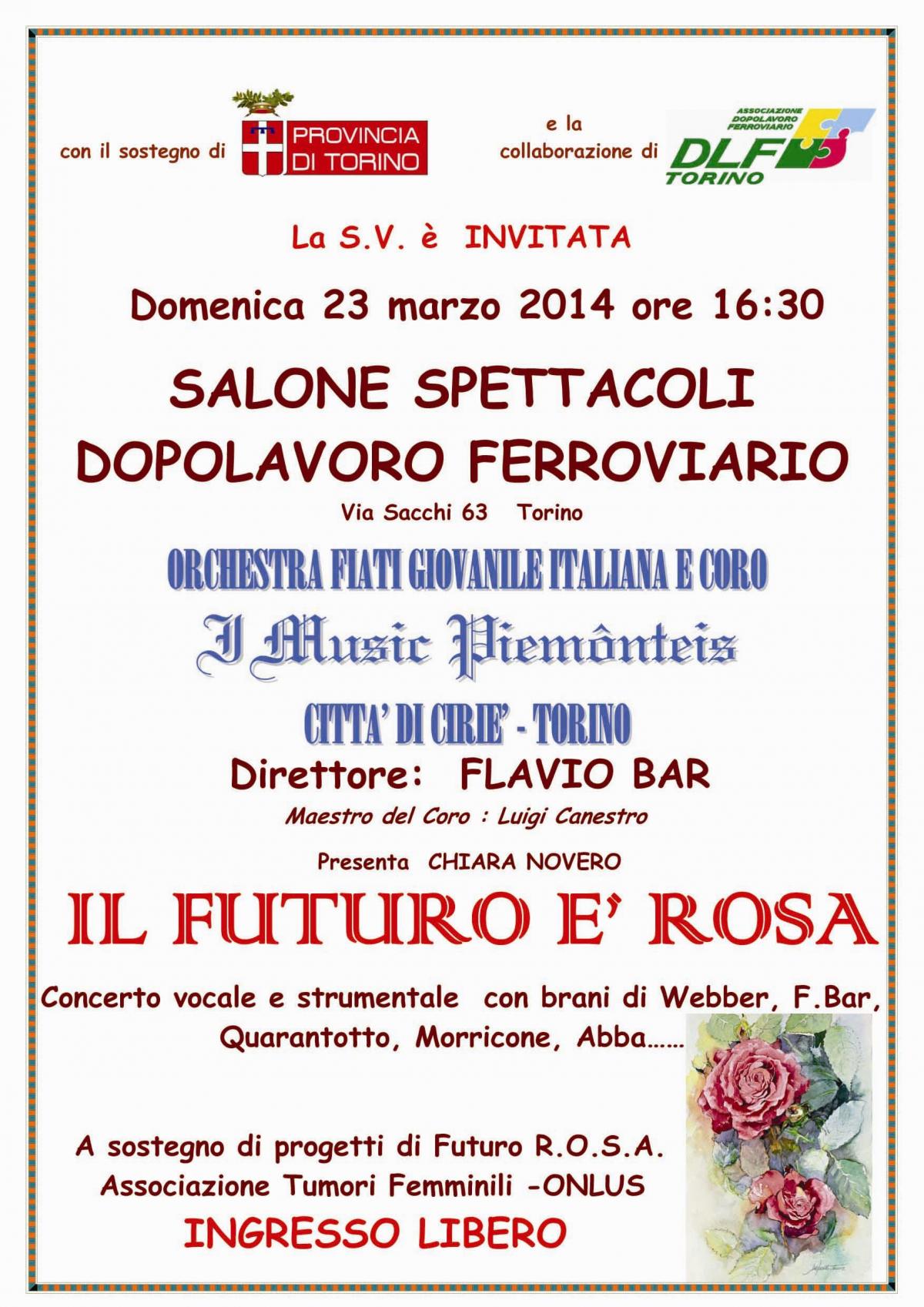 Un Concerto vocale e strumentale che si terrà presso il salone del D.L.F. Torino, alle ore 16,30 di Domenica 23 Marzo. L'orchestra di fiati giovanile che si esibirà lo fa a sostegno di "Futuro R.O.S.A.", Associazione Tumori Femminili - Onlus