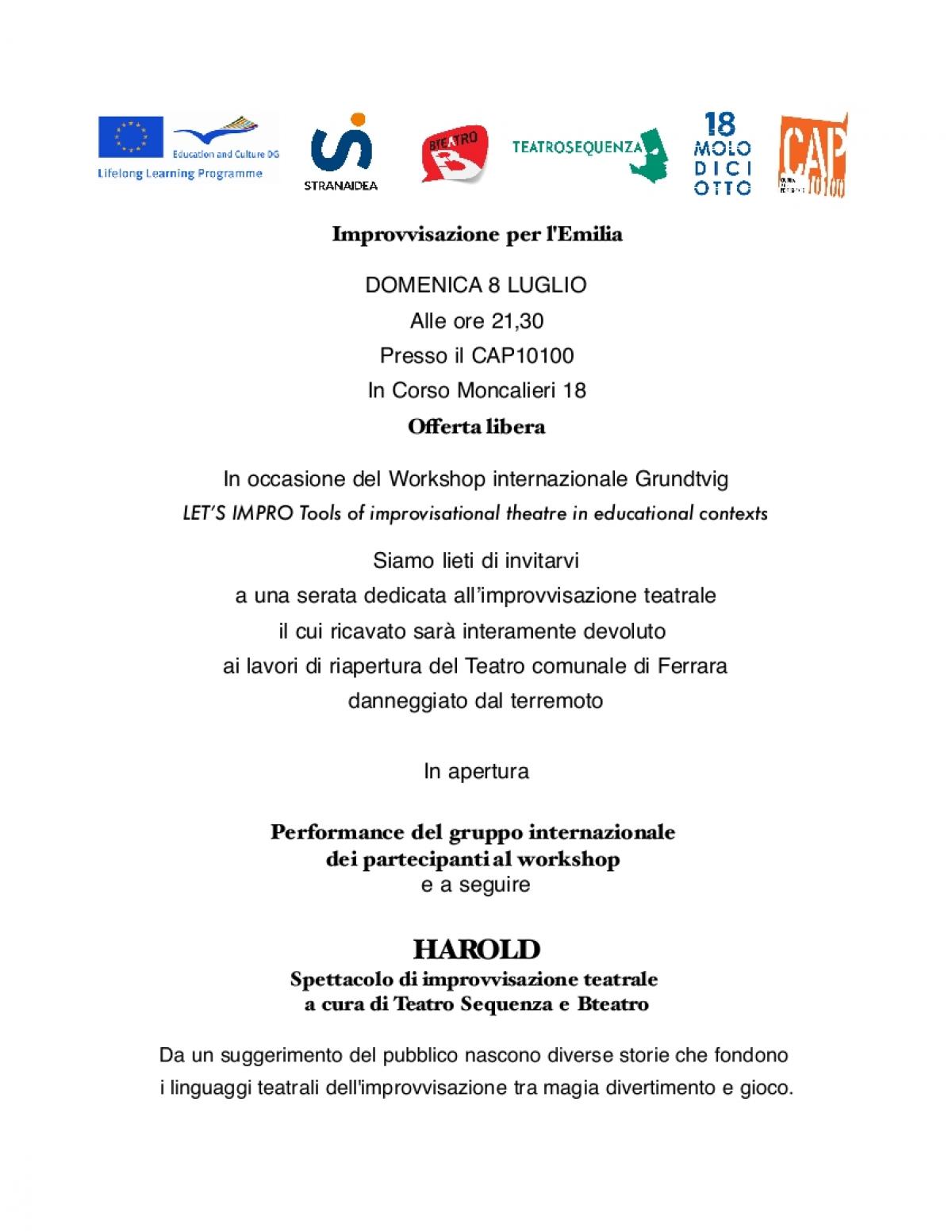 Un suggerimento del pubblico, cinque attori e un musicista …Comico, poetico, caotico, scanzonato, drammatico, irriverente, logico o... solo "HAROLD" può sapere cosa accadrà. Da un suggerimento nascono più storie che fondono i linguaggi teatrali dell'improvvisazione, scivolano una dentro l’altra tra magia divertimento e gioco. È il gioco del teatro e, non a caso. in molte lingue fare spettacolo si traduce con “giocare”.
